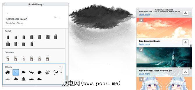 您可以通过在应用中下载任意数量的免费画笔来扩展SketchBook。转到窗口> SketchBook Extras 仔细阅读选择。从云朵到纹理,还有用于漫画,毛皮和工业设计的画笔,等等。