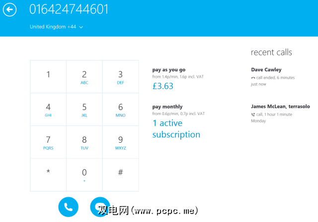 在Skype主屏幕上按电话按钮将打开拨号盘(也可以在通话中打开拨号盘)。通过按+并选择拨号盘(对导航自动菜单很有用),您可以在其中找到最近通话的详细信息以及PAYG或订阅的详细信息。如有必要(您可能会经常旅行),还可以通过下拉菜单更改呼叫的区域。