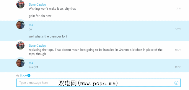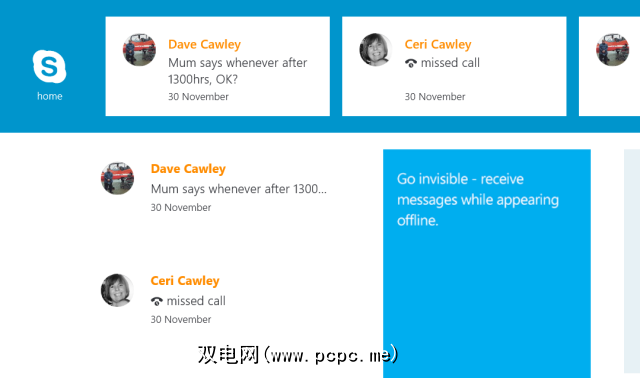 即时消息传递就像Skype这样的服务所期望的一样简单和强大。需要注意的一件事是,如果您拥有话费积分并且在Windows 8的“人"屏幕中设置了联系人的手机号码,则也可以通过SMS发送在Skype中发送的消息。