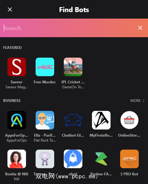 这不是最好的界面,因为它将外国和特定于企业的bot与更广泛的bot混合在一起。查找内容的最佳方法是单击每个类别标题旁边的更多。这将显示该类别中所有机器人的列表(如商业,教育,健康等),并对其进行简要说明。
