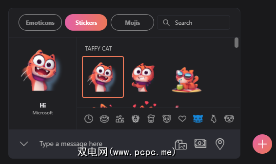 表情符号的类型分为表情符号,贴纸和Mojis。通过单击消息框左侧的笑脸从聊天中访问它们。