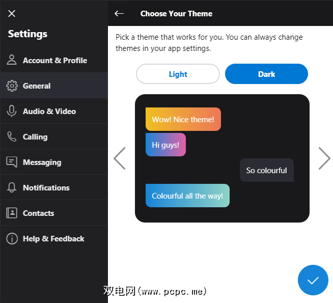 首先,点击主题。在此处,您可以根据要Skype的背景颜色在 Light 和 Dark 之间切换。然后使用左右箭头在不同主题之间移动;聊天预览将向您显示其在消息传递中的外观。完成后,点击对勾图标。