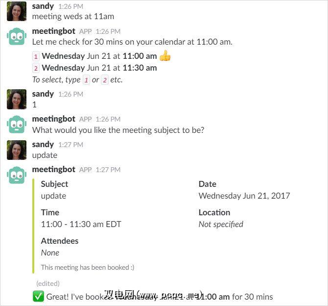 使用Meeting Bot轻松计划和管理会议。这个方便的工具可连接到Google,Office 365和Exchange帐户。当您或团队成员需要计划会议时,该漫游器将显示所有受邀者的空闲状态。然后,您可以快速选择适当的时间。