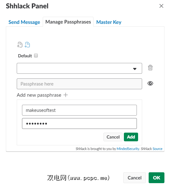 它具有三个选项卡:“发送消息",“管理密码和主密钥。打开“管理密码"标签,然后选择添加新密码。添加密码短语名称,然后添加您的预共享密码短语。预共享密码短语是您需要与预期的加密邮件收件人共享的内容,否则他们将只会看到混乱的字符。