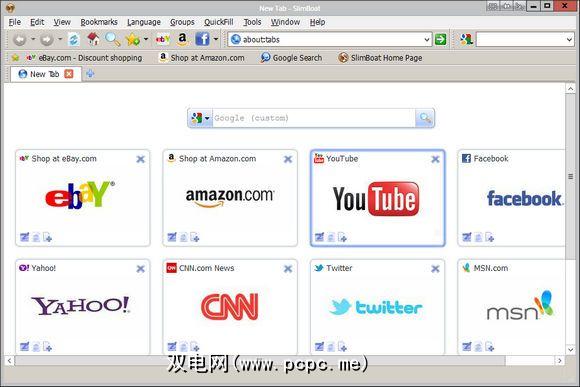 能够方便地从三种最受欢迎的浏览器转换所有收藏的网站,这是永久保留SlimBoat的第一步。如果仅在书签上拖动鼠标是不够的,或者只是选择不这样做,则只需单击一下,SlimBoat起始页就会放置一些网络上最热门的URL。 SlimBoat复制了Opera曾经非常流行的“快速拨号"启动页面,默认情况下提供以下网站: