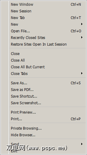 文件菜单显示了以下功能:关闭的站点内存,会话保存,将页面另存为PDF,快捷方式或屏幕截图,私有浏览,以及隐藏浏览器的方法。一切都是很不言自明的。私人浏览非常类似于Chrome的隐身模式,隐藏浏览器非常适合工作环境,允许窗口完全消失,然后在按下热键时重新出现。