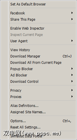 工具菜单包含了SlimBoat的内置功能中剩下的大部分功能。 Web Inspector是SlimBoat的Firebug版本,在Firefox和Chrome中都非常强大。 SlimBoat还允许您在浏览器中更改用户代理。另一个巨大的功能是可以从任何网页批量下载文件的功能。这是DownThemAll的功能!提供给Firefox用户。