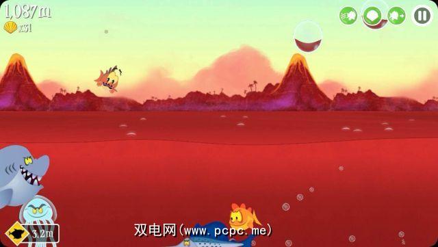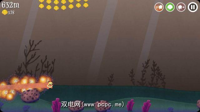 现在您所要做的就是避免鱼在行进路线,并收集尽可能多的带壳硬币。每次碰撞都会减慢您的速度,某些生物会抛出其他障碍物,例如章鱼,它们会在屏幕上喷出墨水,从而挡住您的视线。