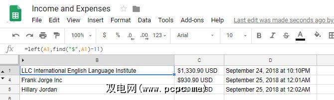 这将提取“ $"和“ USD"之间的美元金额。该脚本只是用最后一列的数字替换A1。