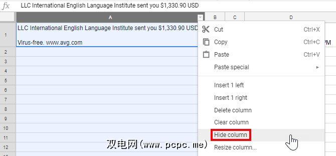 通过隐藏A列来清理工作表。单击A列右侧的向下箭头,然后选择 Hide列。