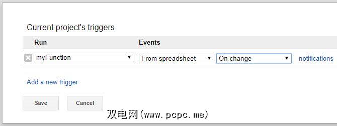 选择 myFunction ,从电子表格,然后从最后一个下拉框中选择更改时。<