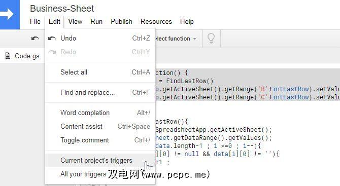 Then configure the script to run every time the sheet updates by clicking on Edit, and Current project’s triggers.