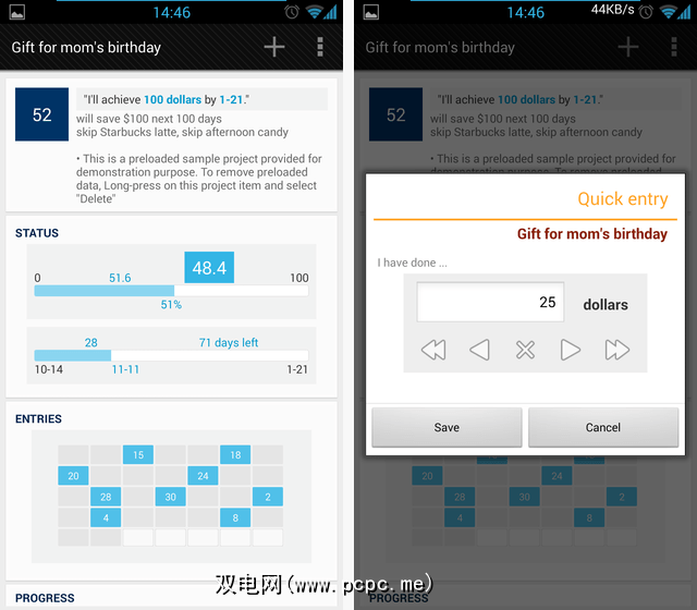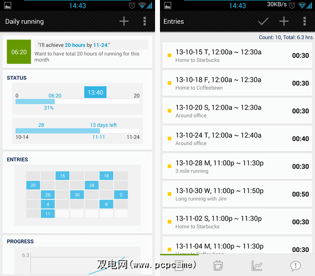在左侧,您可以看到目标概览屏幕,使您一目了然。它从总体目标开始,然后显示您的状态,然后显示带有条目的迷你日历,最后显示一个累积图。请注意上面屏幕截图中的“还剩13天"栏:SMART目标有最后期限,这与基于链的目标会永远持续下去(并不是说一个目标比另一个目标好,但这是值得注意的区别)。