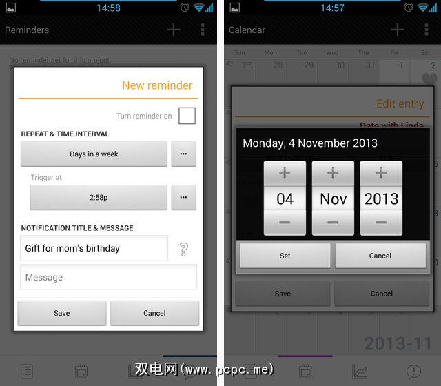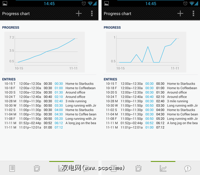 再次,您在应用程序中看到的与上面相同的只是相同的屏幕,仅以两种不同的方式。这很好地表明了您在SmartGoals中会看到的视觉冲突:该应用程序的某些部分具有明显的现代性(正确的屏幕截图感觉像是Holo),而其中的某些部分则似乎牢牢地停留在姜饼时代。