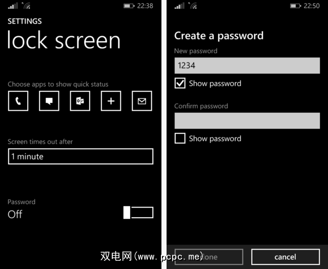 对于Windows Phone,请前往设置>锁定屏幕并找到密码选项。提示:请勿使用此示例中显示的PIN码。
