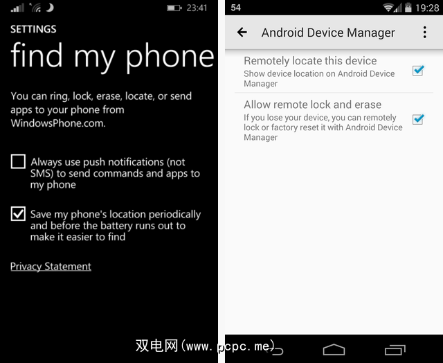对于Windows Phone,您可以在设置>查找我的手机中找到该选项。 如果愿意,可以选择在此处切换两个选项,然后您可以使用该网站来跟踪手机的位置,对其进行响铃或远程擦除。