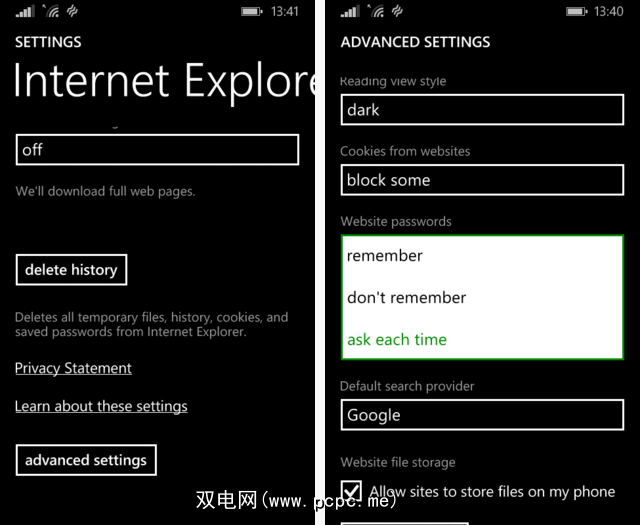 在Windows Phone上,您需要转到设置,滑至应用程序> Internet Explorer ,然后在底部选择高级设置。确保在网站密码下选择了不记得。如果您已经保存了一些内容并想重新开始,请备份一级到Internet Explorer的设置,然后选择删除历史记录。