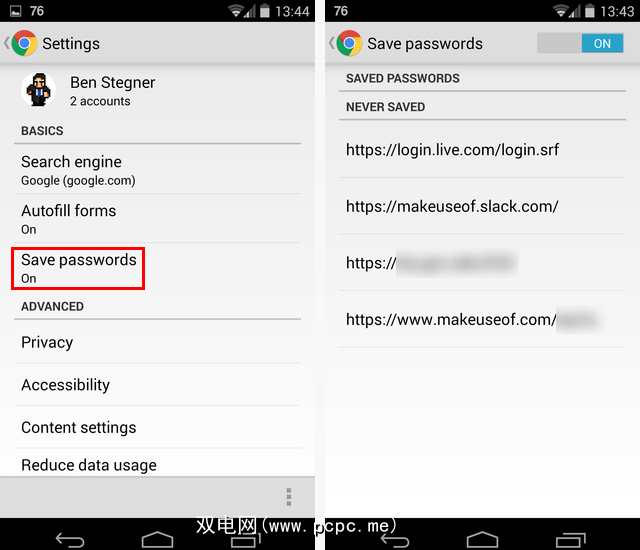 对于Android,打开Chrome,然后点击右上角的三点菜单栏。选择设置,然后在保存密码下,查看设置为记住或不记得的任何内容。您也可以从此处关闭此功能。