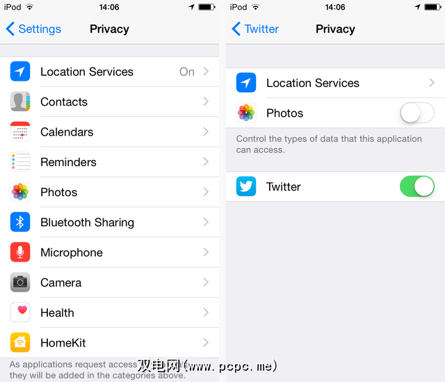 大多数iOS应用会要求您提供各种权限,从访问照片到您的位置。有时您想共享这些以使应用程序正常运行,但是您可能对其他应用程序(例如Facebook Messenger)保持警惕。要查看已授予应用程序的权限,您可以转到设置>隐私以查看权限组。使用iOS 8,您还可以滚动到页面底部的设置并分别查看每个应用。两者都会向您显示相同的信息;唯一的区别是您是希望按应用程序(在右下方)还是按权限类型(在左下方)进行分组。