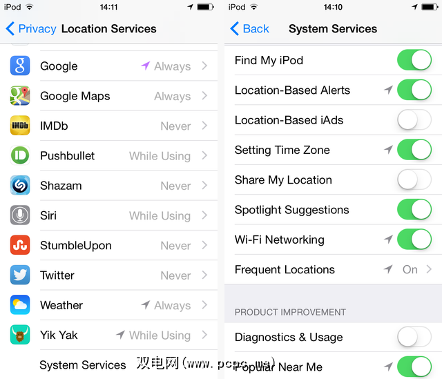 最后,对于iOS,您可以在一个位置调整所有位置共享信息。它埋在设置>隐私>位置服务中;一直滚动到系统服务。。这里您将有很多选择。最好在不需要时关闭基于位置的广告和位置共享,但是将您的位置用于时区并不是隐私问题。确保还要在此处保持查找我的iPhone !
