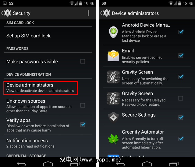 也设置的安全性部分中的设备管理列表中。请注意,此处列出的所有应用程序都需要比大多数Android应用程序更大的权限。我们之前讨论的Android设备管理器就是一个例子。需要将其设置为管理员才能远程擦除您的手机。