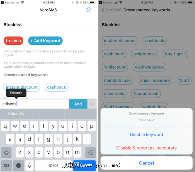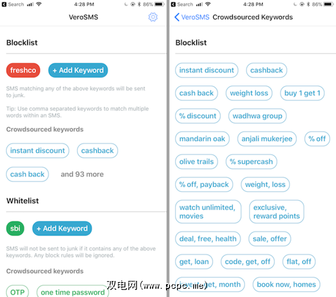在该应用的免费版本中,您可以手动添加VeroSMS应该过滤掉的关键字。这可以是发件人编号,也可以是常见的垃圾邮件关键字(例如销售,现金返还,折扣)。