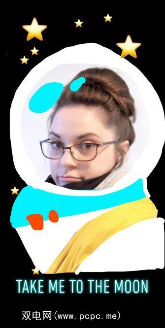在这张照片中,我通过将背景涂黑,将围巾用作太空服的一部分并为白色添加了白色,从而将自己变成了一名宇航员。头盔。然后我使用了表情符号工具来添加星星。
