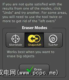 您可以根据要移除的对象的类型或大小选择三种橡皮擦模式。 SnapHeal在应用程序中对此进行了很好的解释,每种都适合删除大物体,许多小物体或点修复。