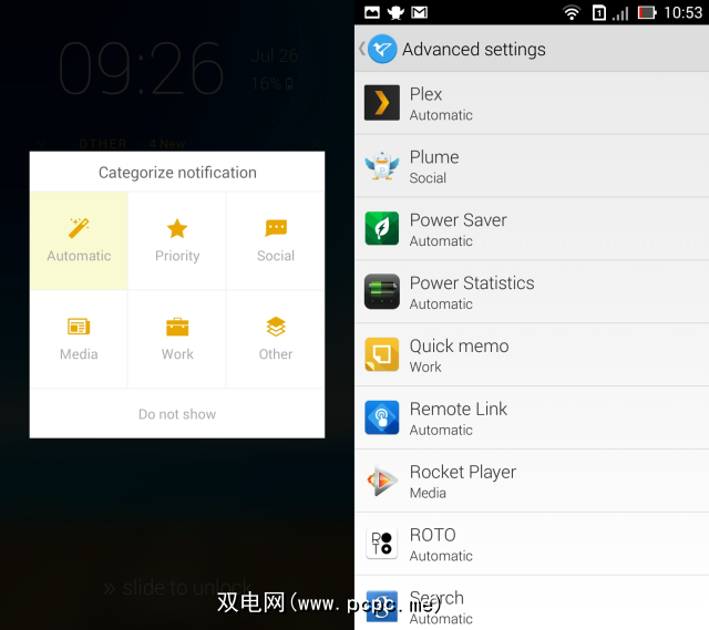 如果您在任何警报上向右滑动,将显示一个菜单以选择类别。有六个选项:自动,优先,社交,媒体,工作和其他。选择一个,该应用程序的所有更新现在将显示在锁定屏幕上的该类别中。您还可以转到Echo的设置并手动将应用分配到类别。
