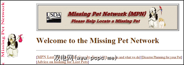 失踪宠物网络是由美国农业部动物保护办公室赞助的免费使用的,基于志愿者的组织。 MPN为美国和加拿大提供了一个数据库,可以按州或全加拿大组织失踪宠物。 MPN不仅适用于狗和猫,还适用于鸟类,马和其他宠物。实际上,他们有一个专门用于马匹的完整数据库。