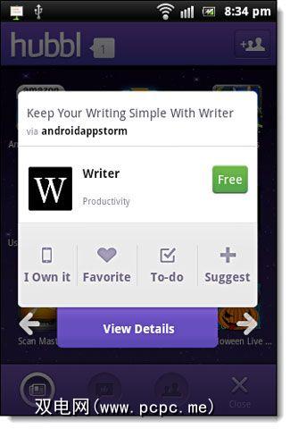 简要概述一下,然后有一个更详细的屏幕向您介绍有关该应用程序的更多信息。如果您已登录免费的Hubbl帐户,则可以给它几个评分点,将其添加到待办事项中进行下载,通过Facebook和Twitter推荐给朋友,然后将其收藏。