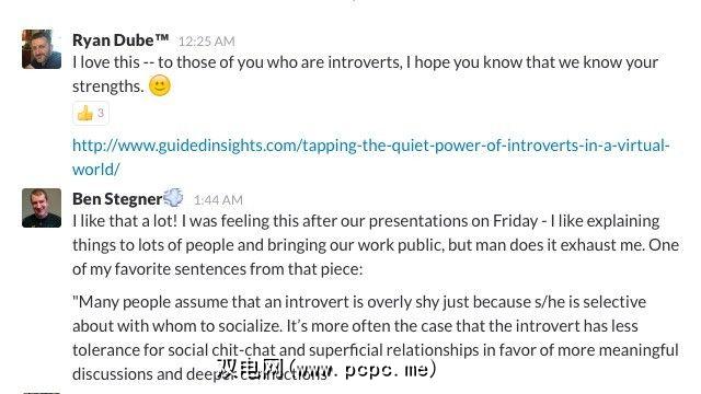 如果您像我一样是一个内向的人,并且在没有什么要说的话的时候拒绝进行闲聊或加入对话的想法,请不要。取而代之的是,做自己最擅长的事-逐个认识人。完成此操作后,即使不像您的Slack团队中一些较活跃的成员那样频繁,您也可以更轻松地添加到群组对话中(而不会感到欺诈)。