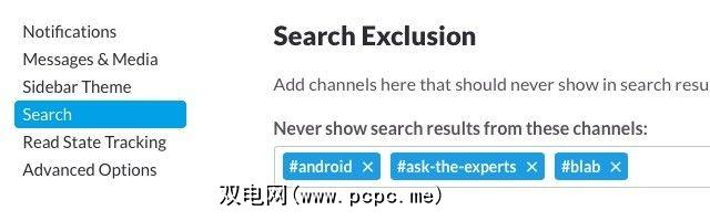 排除特定渠道的搜索结果。如果您想阻止Slack从某些渠道显示结果,例如您不经常使用的标签,可以从 Preferences>搜索。在此处提供的框中,输入频道名称,然后从出现的下拉列表中选择它。这会从搜索结果中排除该频道。