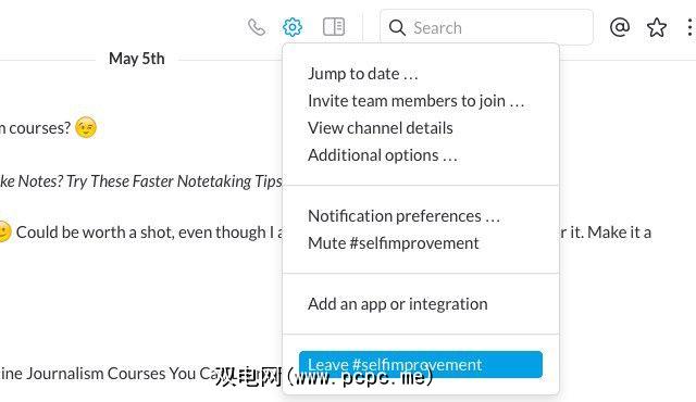 使分心的频道静音。希望您偶尔使用某些频道,而在其余时间忽略它们吗?如果您将那些频道静音,则是可能的。您将停止接收有关它们的通知,但是您仍然可以弹出窗口来阅读或添加其中的对话。最好不要在各个频道上留下用户加入频道和用户离开频道通知的痕迹。您会在与上面离开相同的弹出菜单中找到静音。