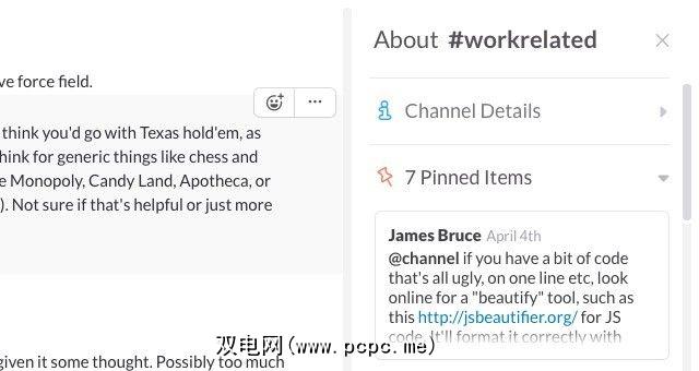 固定消息。为避免有用的信息在频道聊天中丢失,请通过上下文菜单将最重要的消息固定在频道上。这使它们非常容易从频道详细信息部分进行访问,该部分隐藏在搜索框左侧图标的后面。