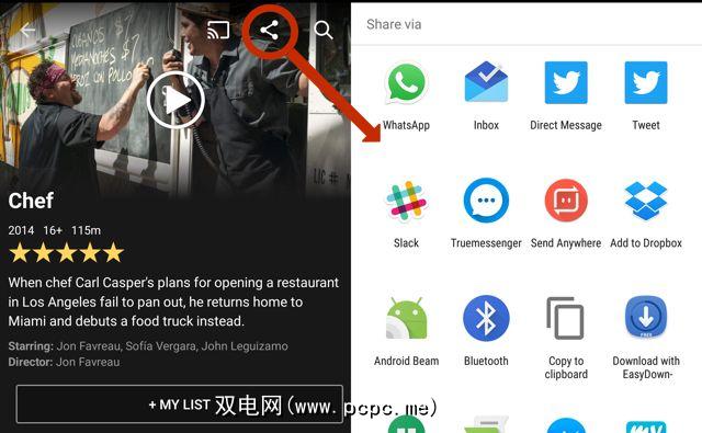 在iOS或Android设备上,浏览至电影或显示喜欢的电影。您将看到“共享"图标,如上图中圈出的图标。点击它以获取手机上所有可用来共享该标题的应用程序的列表。