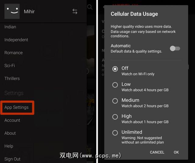 如果您在智能手机或平板电脑上使用Netflix,则可以调整设置,使其仅在Wi-Fi上使用,或使用较少的数据,通过降低质量。在Netflix App中,转到菜单>应用设置>蜂窝数据使用情况>关闭以仅使用Wi- Fi。