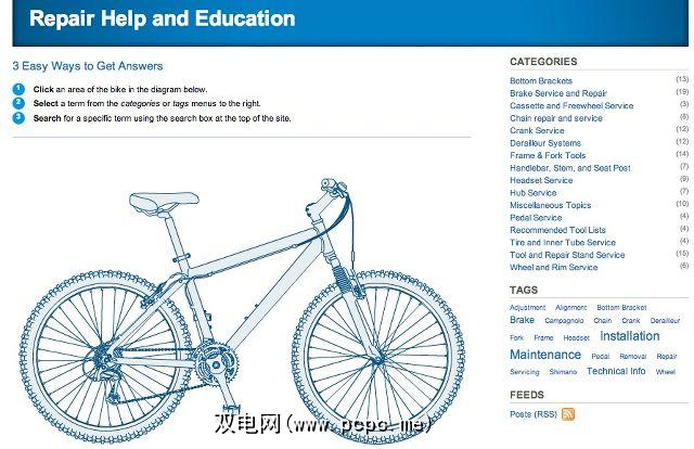 如果您过去在自行车上做过任何工作,则可能使用过Park制造的工具-他们是自行车维修工具的领先制造商之一(您可能会在其上看到其标志性的蓝色)。网站)。在他们的维修部分的主页上,有一张自行车的图像,您所要做的就是单击您需要修理的自行车部分。如果您遇到刹车问题,请点击刹车部分;如果您需要有关底托的帮助,只需单击底托壳。杂项主题部分还包含一些非常有用的文章。