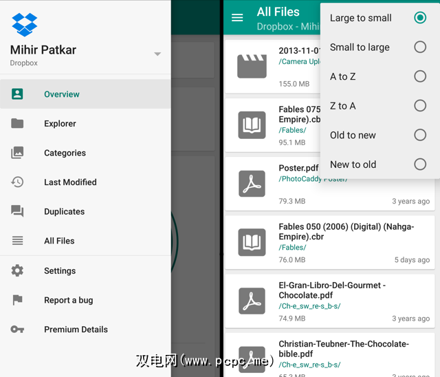 然后,转到菜单>所有文件,然后点击右上角的第二个图标,它看起来像三行不同的长度。点击从大到小,以将所有文件(包括文件夹中的文件)从大到小排序。现在,选择要删除的文件并删除它们。记住,您已经删除了重复项,所以这是该文件在Dropbox上的最后一个副本!