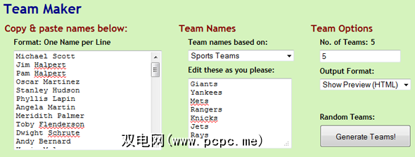 它的工作原理是:输入纯文本名称列表,每行一个名称。然后,您输入一个单独的潜在团队名称列表。最后,选择要为其生成名称的团队数。根据您的所有输入,Team Maker将为您创建团队。默认结果是直接在网站上输出HTML,但是您可以根据需要将其导出到Excel CSV文件。