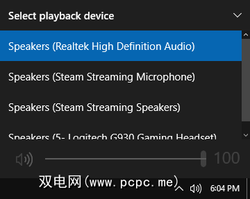如果您有多个音频设备,例如扬声器和耳机,您会发现自己不断在它们之间来回切换。为此,请点击任务栏托盘中的扬声器图标。点击您当前的音频设备名称,它将弹出其他选项的列表。只需单击您想要更改的音频设备。