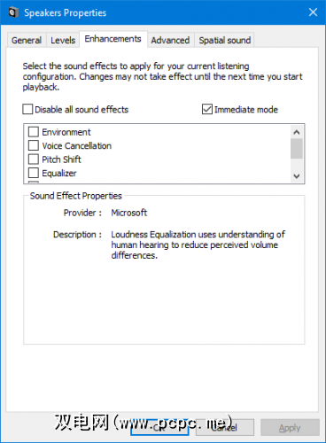 双击要更改的播放设备。切换到增强功能标签。要立即应用它,因此您可以快速测试这些选项,勾选立即模式。