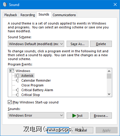 使用声音方案下拉菜单在默认的Windows选项之间切换。如果要使所有声音静音,则可以选择无声音。