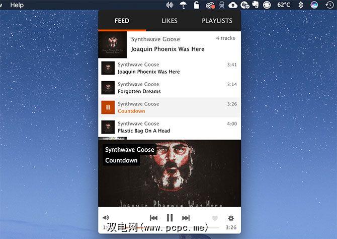 该应用程序的方法异常简单,并且经过精心设计,可以放置在Mac菜单栏中,直到您需要它为止。随时单击该应用程序的图标,以显示用于您的 Feed ,喜欢和播放列表的三窗格窗口。我无法加载“播放列表"选项卡,但是我似乎从未使用过SoundCloud播放列表,因此我没有进行分阶段操作(请注意这一点)。