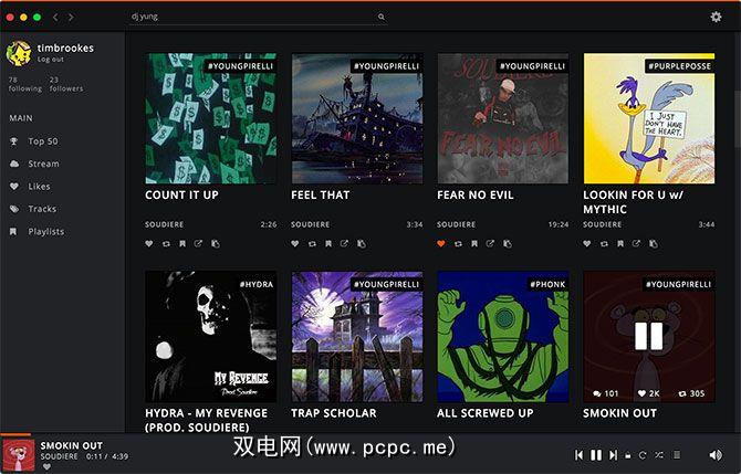 乍一看,您会被误认为是原谅。适用于官方应用的Soundnode。它使用一个柔和的深色主题,带有一个侧边栏,用于沿窗口底部的导航和媒体控件。该应用程序的其余部分专用于内容,与iTunes一样,曲目和播放列表以1×1的大方块显示。