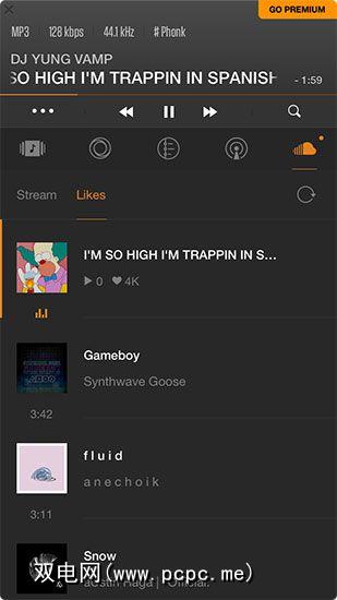 登录并注册后,您会看到一个SoundCloud图标,可以访问您的流和点赞。没有播放列表支持,也无法查看或发表评论,但是如果您将鼠标悬停在正在播放区域并单击心脏图标,就可以喜欢曲目。