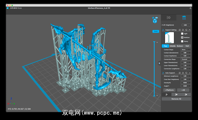 从那里开始,只需将其拖动到对象中,然后根据需要重新定向,然后添加支撑。就像长丝打印机一样,树脂打印机也会出现模型悬垂的问题。一切都必须连接到构建板上的某物。否则,它只会在树脂底部的FEP膜上固化,而不会在构建板再次升起时被拉出。