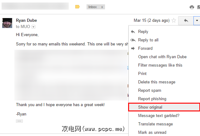 在任何电子邮件中(如果您没有收到垃圾邮件,请收到垃圾邮件的人将其转发给您)复制),只需点击回复按钮右侧的小箭头以显示所有选项,然后选择查看原图。。在这里您可以看到所有电子邮件的技术细节(很遗憾,但是我们习惯的观点很容易伪造)。