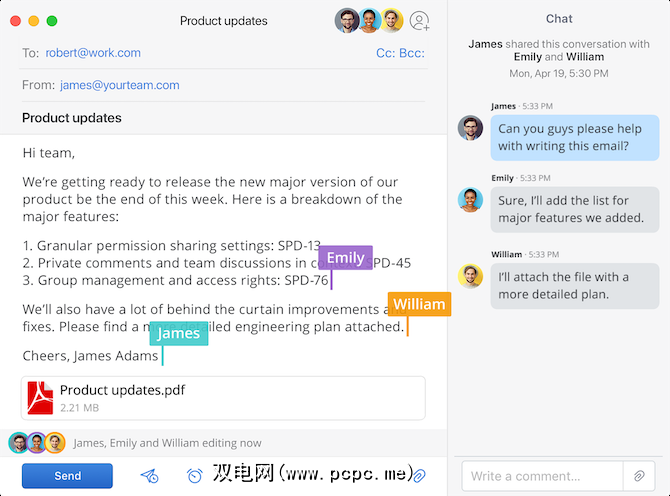 就像处理文档一样,您可以撰写并与同事实时编辑电子邮件草稿和回复。 Spark有一个本机消息传递侧边栏,您可以在其中与活动编辑器聊天并交换建议。如果您要管理团队,Spark还允许您将电子邮件委派给成员并设置成员的截止日期。