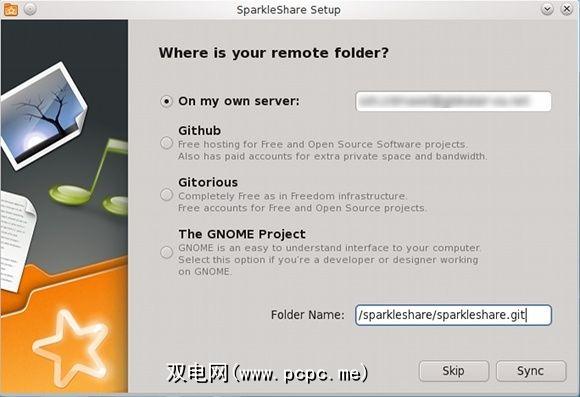 由于Sparkleshare使用GIT,因此您可以关于文件存储位置的多种选择。首次启动Sparkleshare时,该设置为您提供了一个可供人们免费使用的前三个运行GIT的网站的选择,以及定义自己的服务器的可能性。